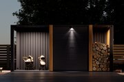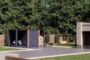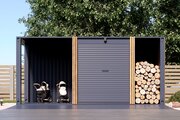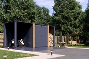 Хозблок оборудован двумя открытыми секциями, что способствует удобному хранению садовой, снегоуборочной и прочей техники.